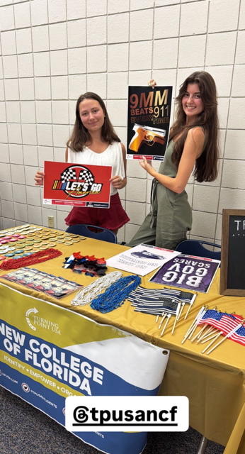 A New College Turning Point chapter was established in 2023 by third-year student Jackson Dawson. The club has not had a strong presence on campus and has hosted a couple of events that have not caused much controversy. Turning Point, like all New College-approved clubs, tabled at Novopalooza and passed out decorative buttons and flags.