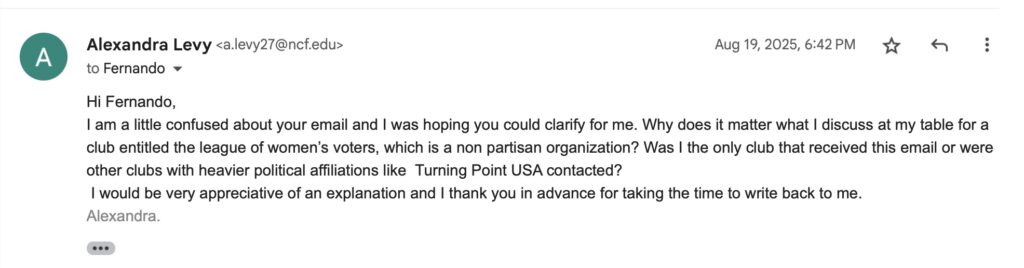 The New College chapter of LWV was cautioned before I even set up a table, but Turning Point’s speech was permitted with no issues. I felt intimidated, but I learned that the very essence of democracy is the freedom to ask, to question and to do one’s own research. Be polite, be respectful, but do not be afraid. When society as a collective stops asking, institutional fascism thrives. When we allow ourselves to be bullied by authorities in power, that is when free speech truly dies.