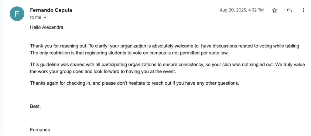 After the event, I met with Capula to discuss the school’s intentions behind these emails. He refused to speak on the record, but my impression from our conversation was that he was told by his director to issue information barring my club from registering students to vote and discussing voting without fully grasping the gravity of what he was insinuating. Capula has only worked at SAUCE for one year and is still learning how to follow instructions from his superiors while advocating for students. I believe that he accepted accountability for the misinformation and was open to my feedback about how to better navigate student interests.