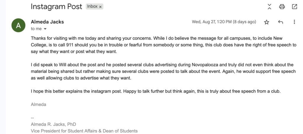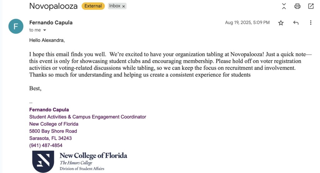 That the poster was permitted at Novopalooza and subsequently posted on an Instagram account representing New College unnerved me, especially in light of the administration’s detailed email restricting voting-related conversations. While I had to push hard for my club’s message, Turning Point’s message was allowed and even defended. I sent an email to New College President Richard Corcoran and Vice President of Student Services Almeda Jacks to voice these concerns.