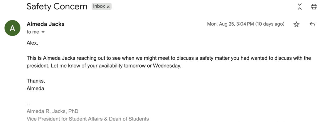 Screenshot of email from Almeda Jacks to Old School Catalyst reporter. Screenshot by Alexandra Levy.